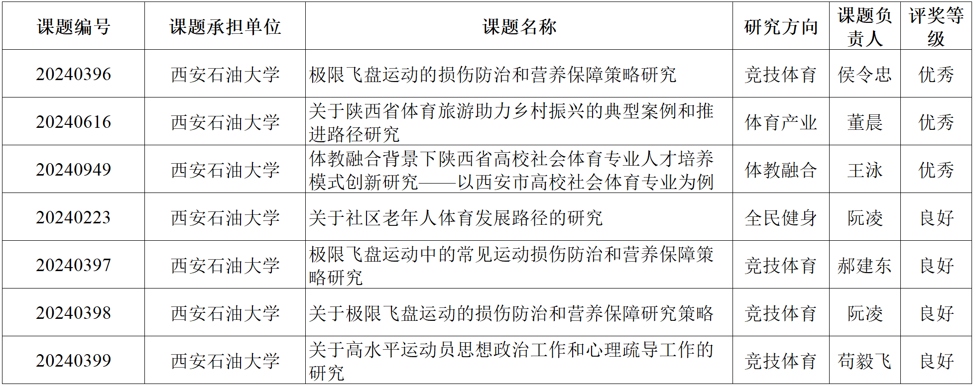 近日,陕西省体育局发布《陕西省体育局关于2025年度常规课题结题的通知》陕体函〔2025〕183号文件,体育学院喜获丰收。经评审,学院共有7项课题通过结题验收,其中3项获评“优秀”、4项获评“良好”。同时,学院获批陕西省体育局2025年常规课题17项。