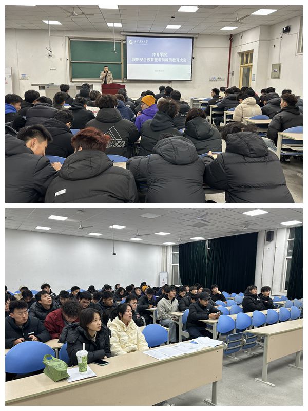 为进一步加强考风考纪教育,培养学生诚信品格,规范考场秩序,同时,在节假日来临之际,提高学生的安全意识,筑牢校园安全防线,12月22日至24日,体育学院各年级组织召开了考风考纪暨离校安全教育大会,学院学工办主任姜国平,辅导员张泽正以及全体本科生参会。