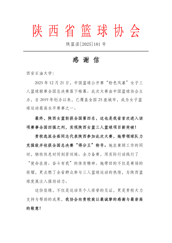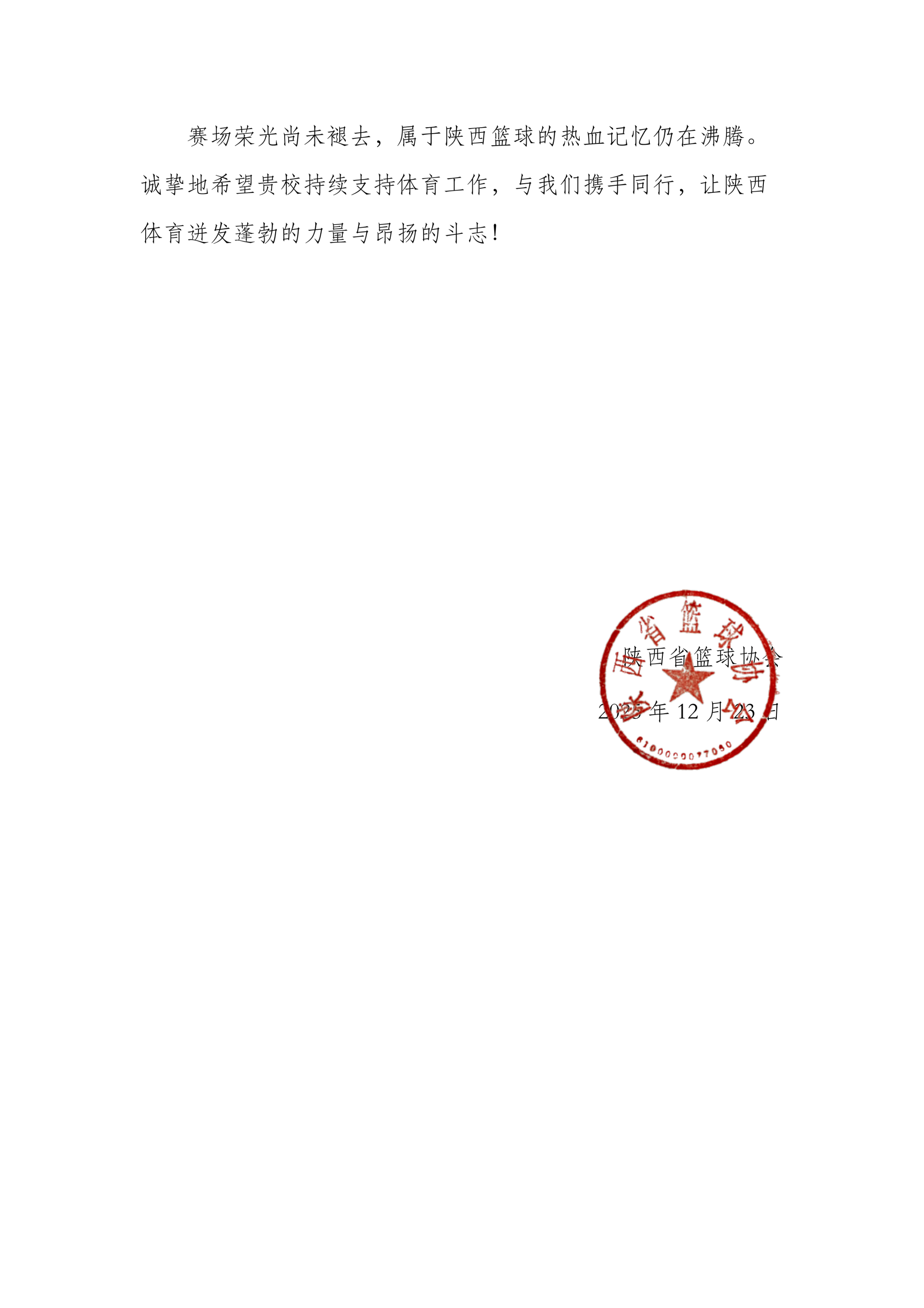 这份佳绩,不仅是运动员个人荣誉的见证,更是贵校大力支持与帮助的成果,我协会向贵校致以最诚挚的感谢与最崇高的敬意!赛场荣光尚未褪去,属于陕西篮球的热血记忆仍在沸腾。诚挚地希望贵校持续支持体育工作,与我们携手同行,让陕西体育迸发蓬勃的力量与昂扬的斗志!