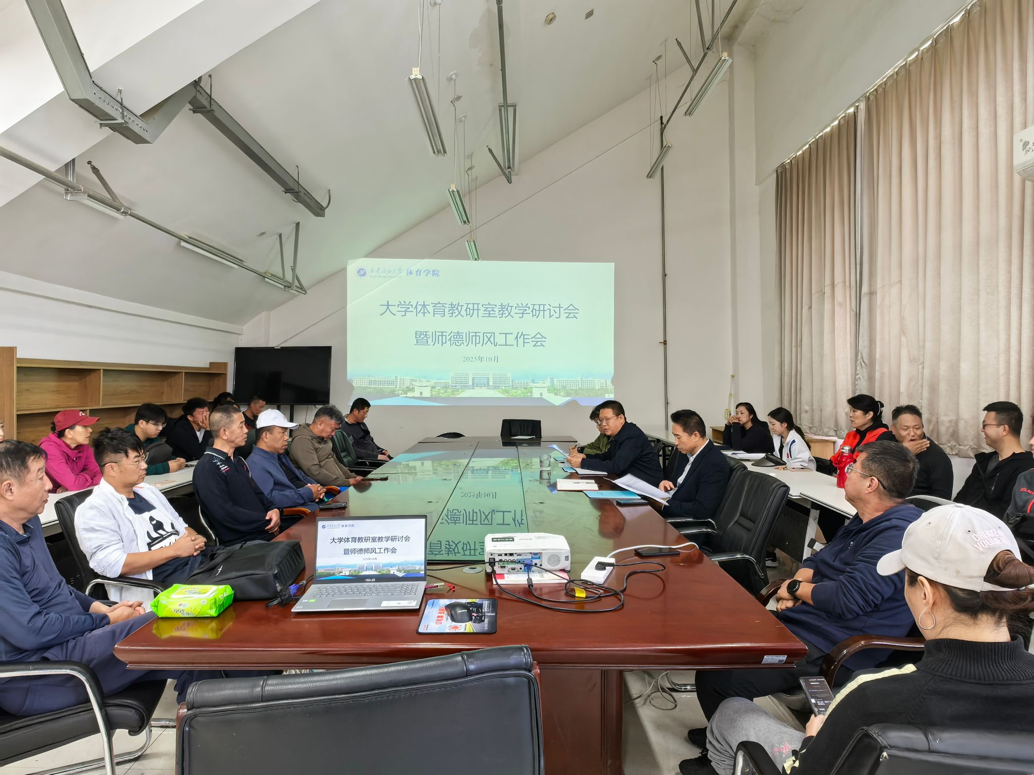 10月15日,体育学院在鄠邑校区学院会议室召开大学体育课程教学研讨会暨师德师风工作会,本次教研活动主题为“筑牢师德师风,深化课程改革,提高课堂教学效率”。体育学院党政领导刘小波、李寿邦、阮凌,大学体育教研室主任刘丹青和全体大学体育教研室教师参加会议。会议由体育学院副院长阮凌主持。